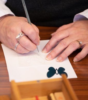 In the jewelry workshop, sit at a workbench, shape the metal and encrust it with vegetable ivory to create motifs on the wings of a jeweled butterfly.