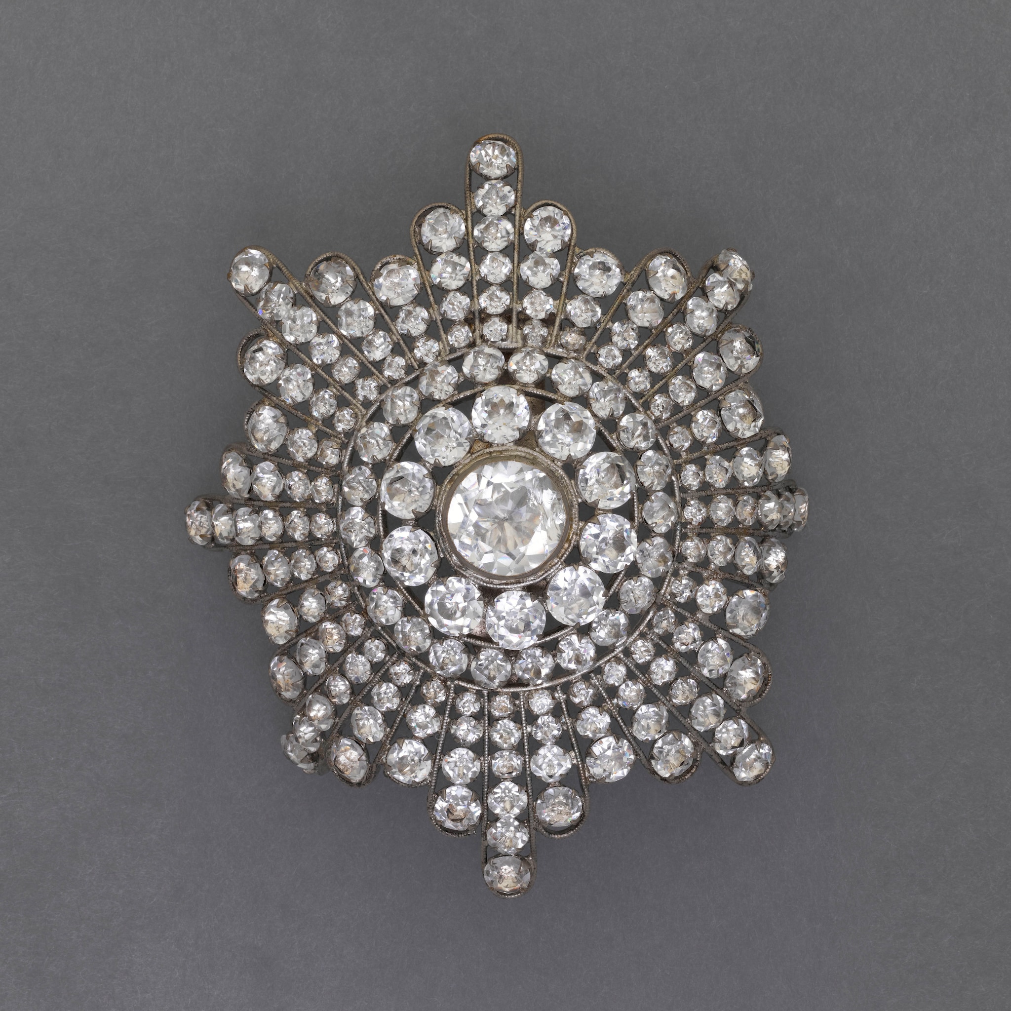 Photo: Star shaped imitation Order (for nobility) worn by Hortense Schneider in the title role of La Grande-Duchesse de Gérolstein (The Grand Duchess of Gerolstein), jeweler Joseph Hirsch, Paris, 1867. Silver-plated brass, white rhinestones. H. 8.5cm; L. 10cm. Compiègne, National Museum of the Palace of Compiègne, inv. C.69.029. Claudette Joannis © Réunion des Musées Nationaux. Photo © RMN / René-Gabriel Ojéda.